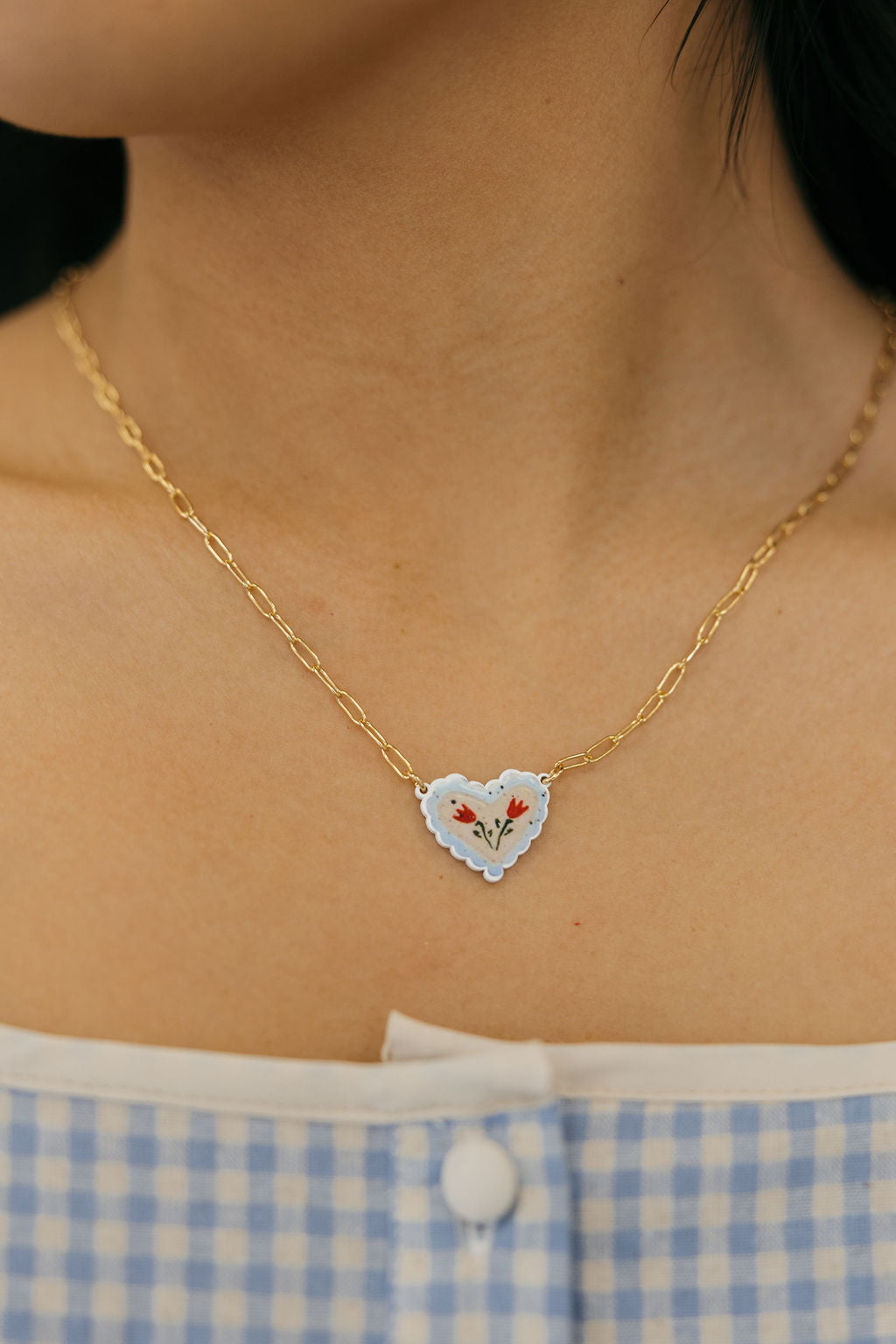 Add a sweet touch to your everyday style with the Megan Heart Necklace – Blue/Red. This delicate gold chain features a charming heart-shaped pendant with soft blue edging and a hand-painted floral design in warm red tones. Feminine and playful, it’s the perfect piece to wear on its own or layered with your favorite necklaces. The Megan Heart Necklace brings a hint of vintage-inspired charm to any outfit.