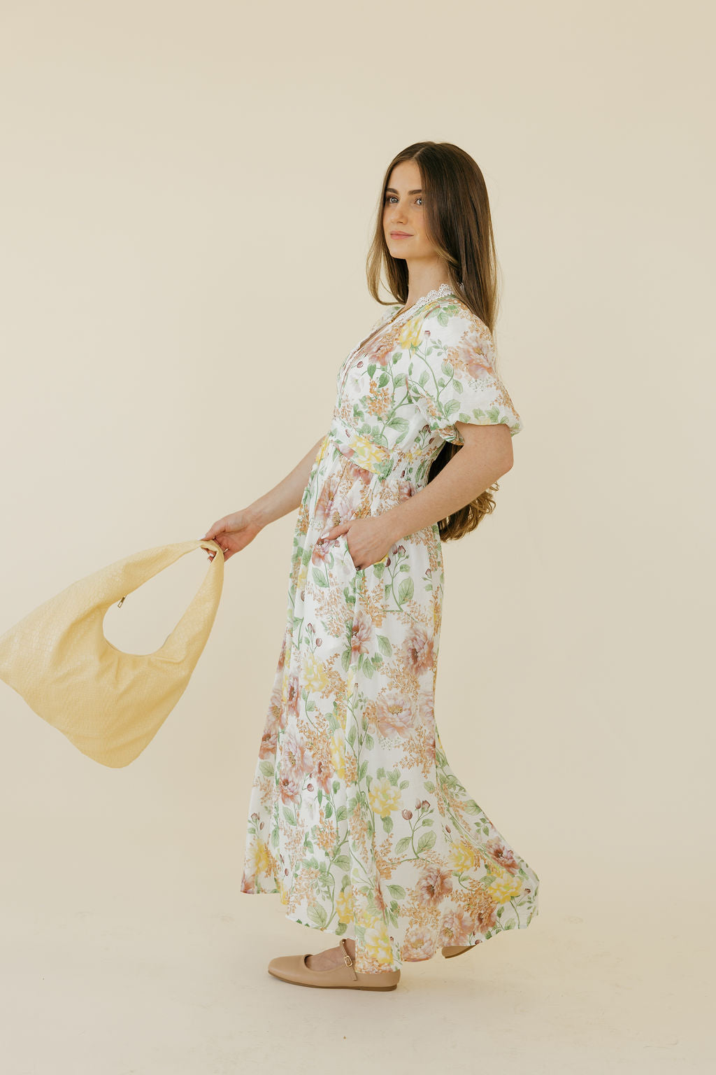 The Cordelia Dress is your go-to piece for effortless elegance with a playful twist. This midi beauty features a charming floral pattern in soft ivory tones, paired with delicate lace trim along the V-neckline for a touch of romance. Short puff sleeves add a whimsical detail, while the flowy skirt moves gracefully with every step. Perfect for garden parties, brunch dates, or any occasion calling for understated charm with personality.