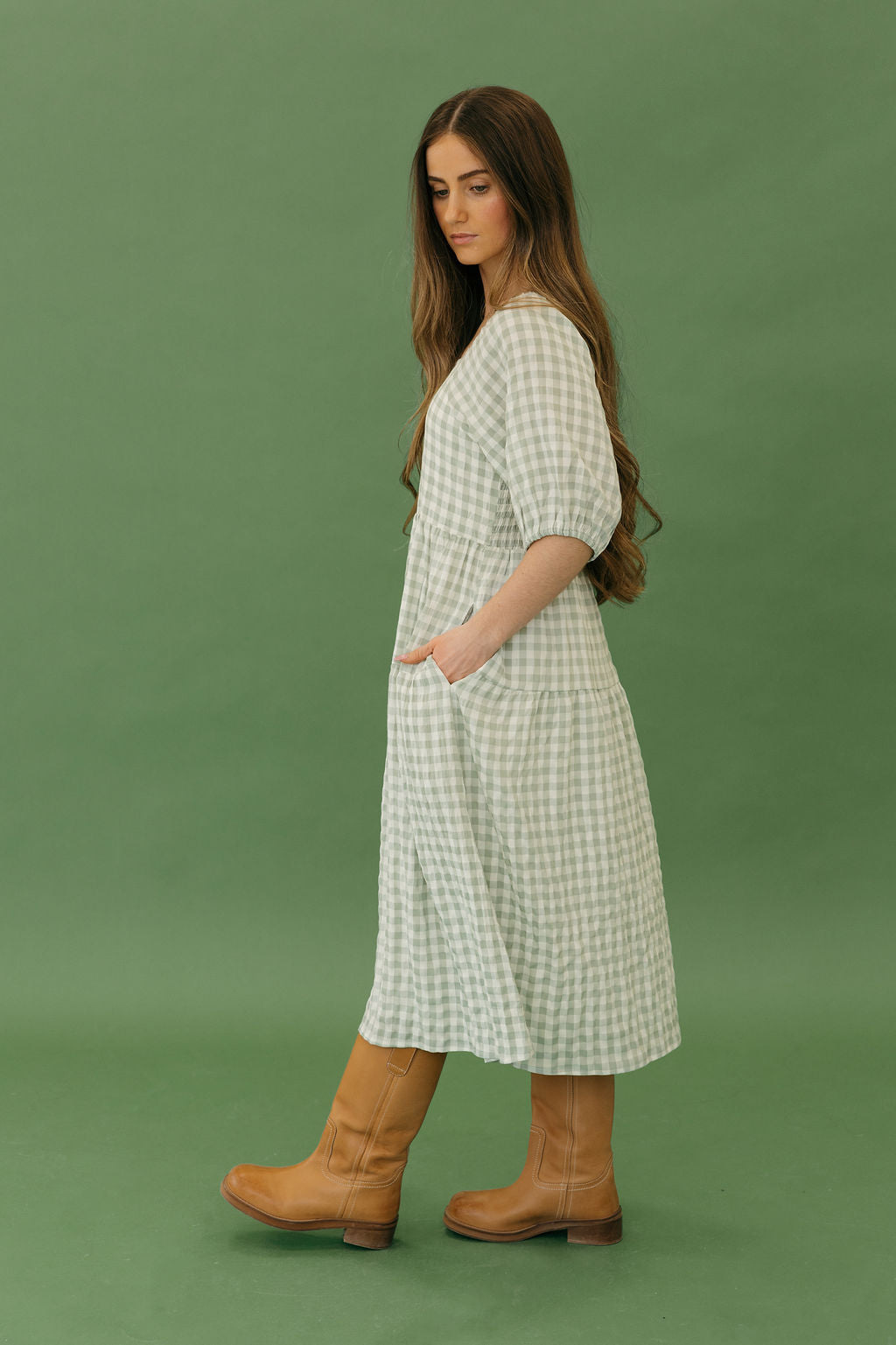 Jensyn Dress-Sage Gingham, boutique clothing, casual, the perfect dress!