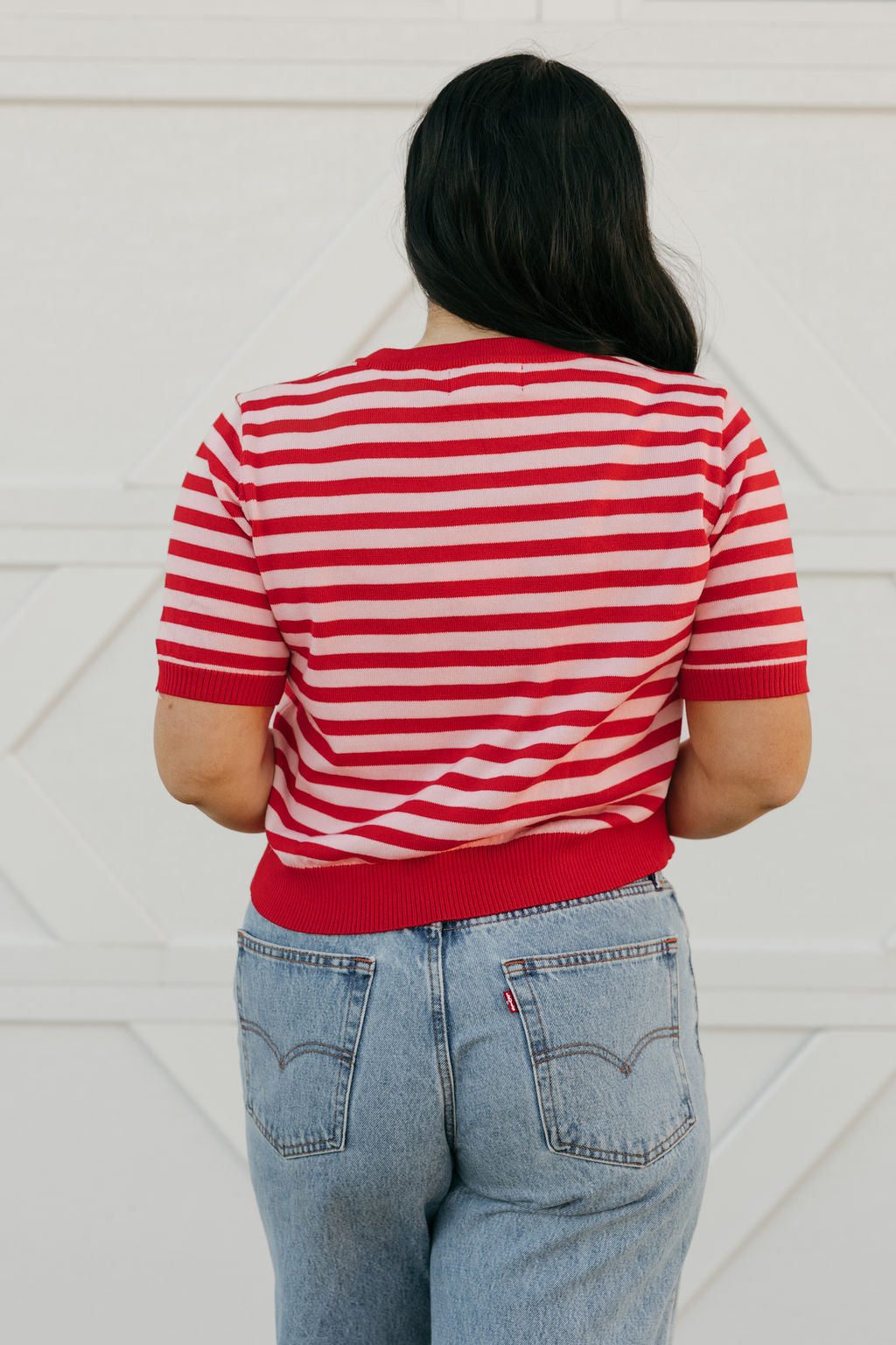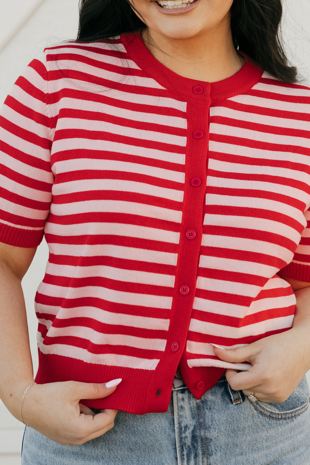 Elsie Cardigan – Red/Blush is a playful twist on a classic staple. With its bold red stripes and soft blush contrast, this short-sleeve cardigan adds the perfect pop of color to your everyday wardrobe.