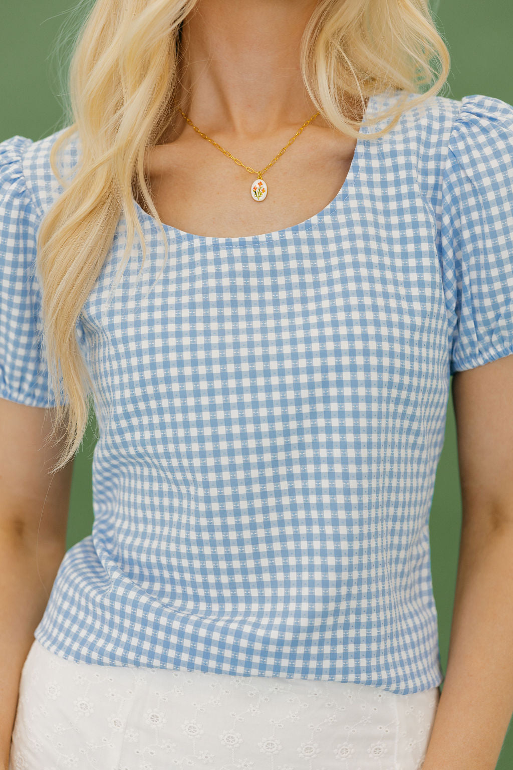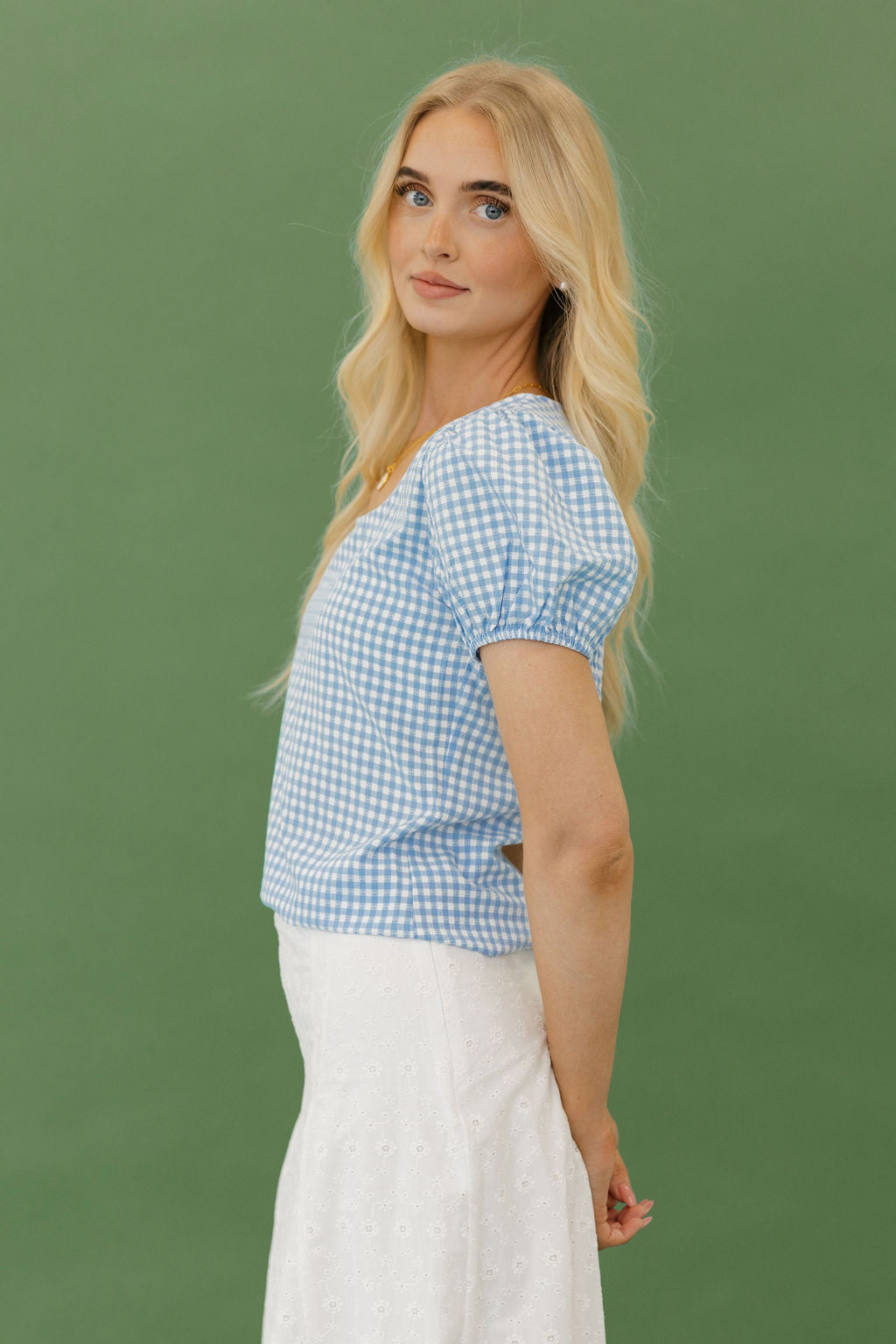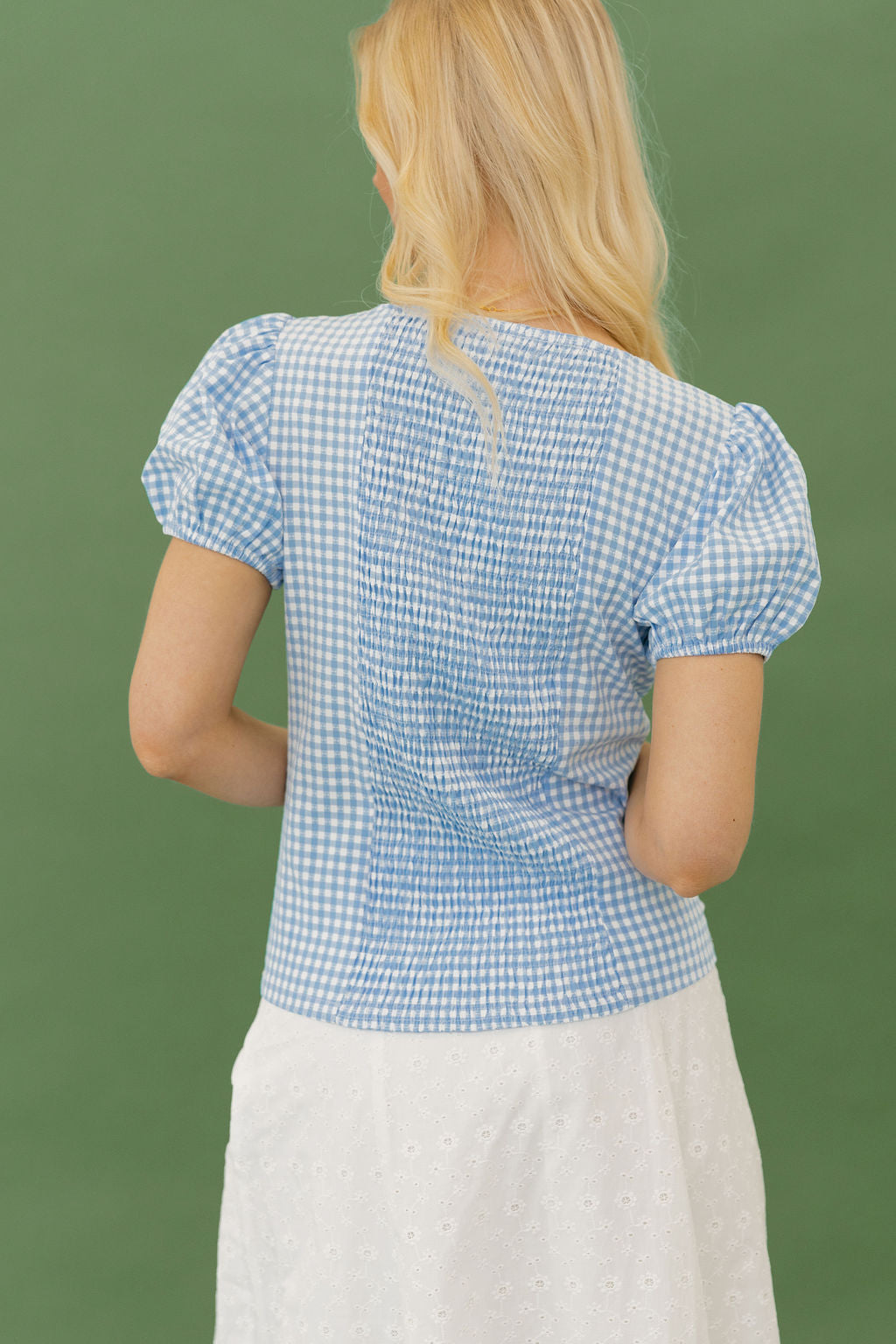Camrie Top – Blue Gingham is the sweet, flattering piece your spring wardrobe needs. With its classic gingham print and feminine silhouette, this top blends timeless charm with a modern, figure-loving fit.