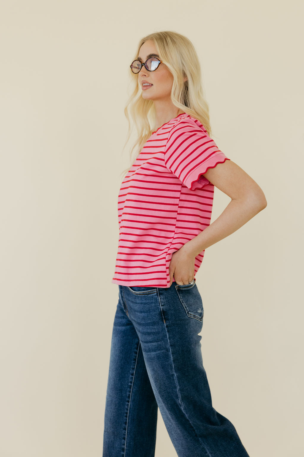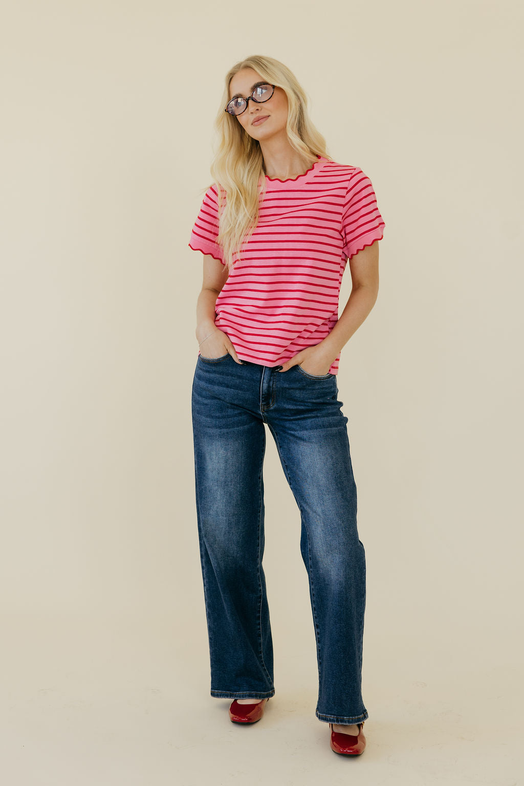 The Mindi Top in Red/Pink features perfectly scalloped edges that add a charming touch to your look. Its modest, non-see-through fabric keeps things comfy and confident, while the slightly cropped style offers a fun twist without revealing too much. Designed to be garment and maternity friendly, this top moves with you, making it a playful yet practical addition to your wardrobe.